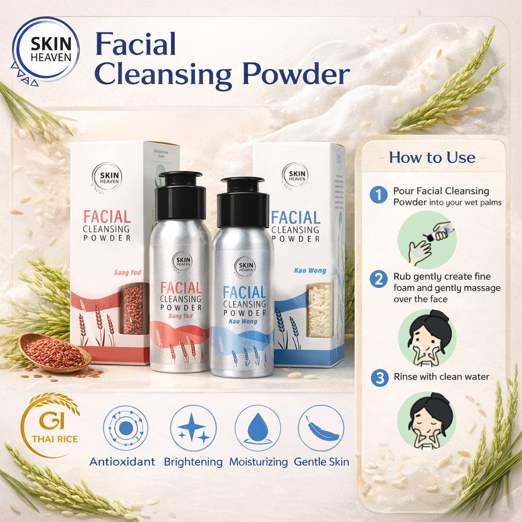 ด้วยคุณสมบัติพิเศษของข้าวทั้งสองสายพันธุ์ — หอม นุ่ม อุดมคุณค่าทางโภชนาการ และสืบสานภูมิปัญญาชาวนาไทย — SKINHEAVEN ได้นำ ผงข้าว GI จากข้าวเหนียวเขาวงและข้าวสังข์หยด มาพัฒนาเป็นสูตรผลิตภัณฑ์บำรุงผิว